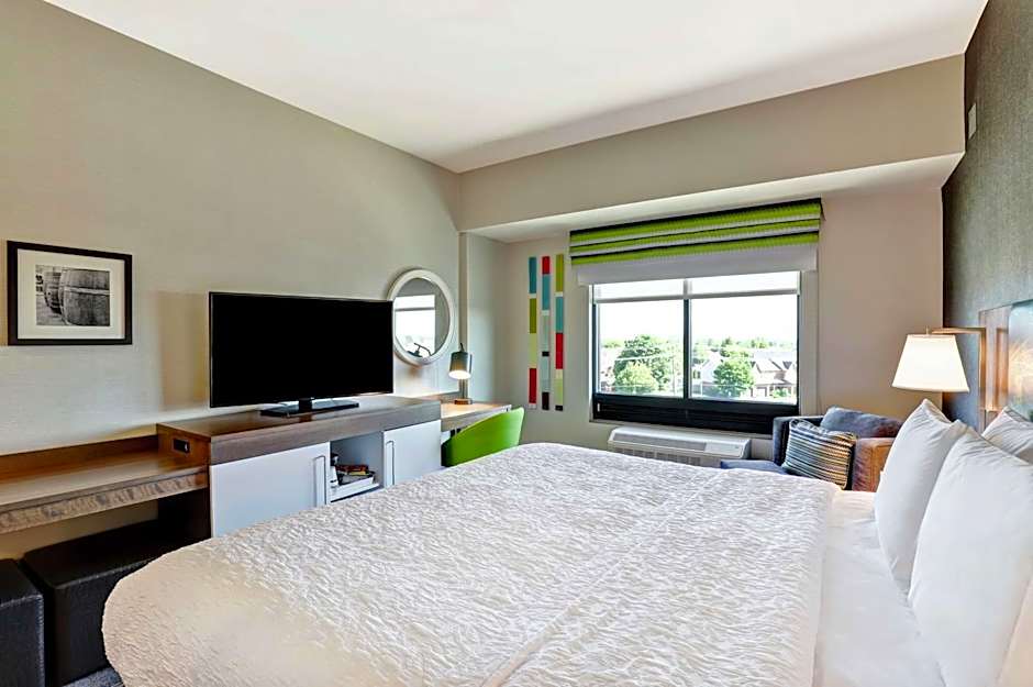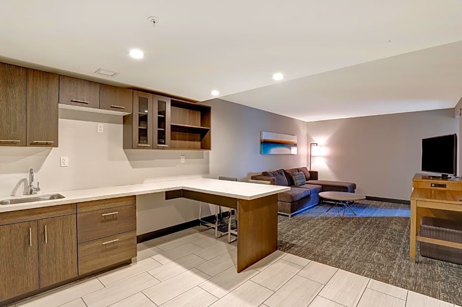 This guestroom features a tea/coffee maker, seating area and a 50-inch flat-screen TV. A refrigerator and air conditioning are provided.